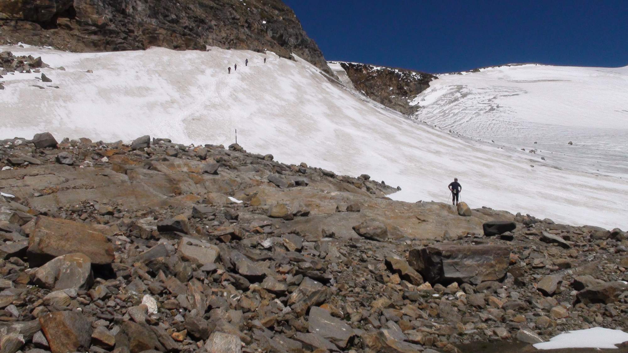 Odpolední sluneční paprsky se opřely do sněhu, takže jsou všude vidět pramínky z tajícího sněhu. Dobíhám sestupující pár. Prohodím s němi pár slov a definitivně se loučím. Dostávám se na okraj prvního ledovce, který je nasákly jako houba s tajícího sněhu. Dobíhám k chatě, ale jsem v časové tísní, protože je již po 15 hodině a ještě mám před sebou na kole 80 Km.