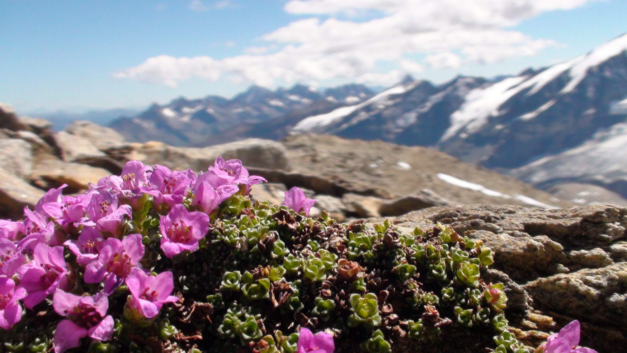 Mittlerer Bärenkopf 3358m. Sednu si, abych ujedl ze svých zásob. Třepe se mnou zima, tak sáhám do svých bohatých „izolačních“ zásob a oblíkám si bundu, abych si trochu více těch rozhledů užil. Po deseti minutách vyrážím zpět. Zpět náročnější část hřebene překonávám s větším sebevědomím a jistotou, takže s větším rizikem. Cestou dolu mezi sněhovými pásy se občas najde i místečko s mikro florou.
